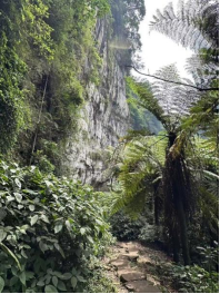 大峡谷是国家一级保护植物桫椤栖息地,桫椤与恐龙同代,距今已有2亿年历史,被称为"植物界的大熊猫"。行进途中,师生一边观赏数万株桫椤雄姿英发,一边探讨学术人生问题,在回归自然的爽朗轻松中,身心得以放松,品行得以砥砺,情操得到陶冶。一路笑语欢声,话题不断……