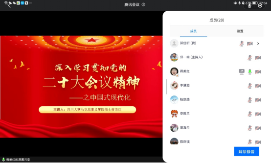 2020级硕士第二党支部特邀请四川大学马克思主义学院的蒋美红同志进行“中国式现代化”的专题分享。此次二十大精神学习活动于2022年11月11日通过线上方式(腾讯会议)进行,支部副书记邱一崎主持会议。