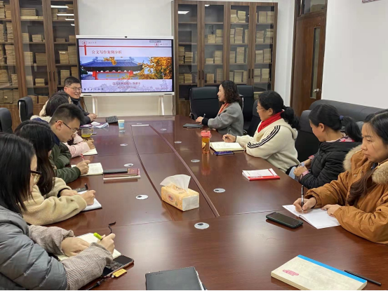 全体管理人员作公文写作的提升培训,会议由学院专职组织员石琼主持。
