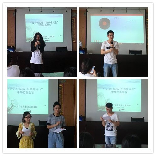 2017级硕士第二党支部在望江文科楼五楼会议室举办了“诗词恒久远,经典咏流传”的中华经典品鉴活动,本次活动旨在弘扬和传承中华民族的传统诗词文化,提升支部成员的文学素养,进而增强文化自信。参与本次活动的有支部书记何玉霞老师、支部10名党员同志以及10名入党积极分子同学。