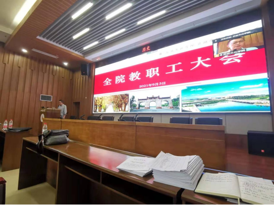 2021年9月3日,历史文化学院在江安校区文科楼二区学术报告厅召开全院教职工大会。会上,学院党委副书记、纪委书记姜华向全院教职工开展2021年师德师风警示教育,学院全体党政领导、全体行政人员、部分教职工在主会场参加会议,博物馆、古籍所教职工在分会场参加会议。