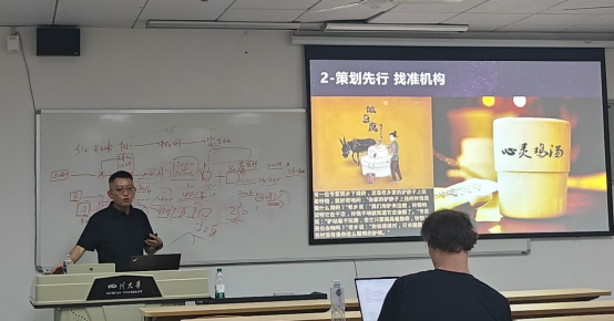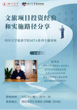 2025 年 5 月 23日, 愿景文旅创始人兼总经理、MTA 行业导师、2000级旅游管理专业校友何季东,应邀再次来到四川大学旅游学院,为同学们带来了一场主题为 “文旅项目投资经验和实施路径分享” 的精彩讲座。此次讲座于文科楼三区402教室举行,由四川大学旅游学院院长助理王俊鸿副教授主持。