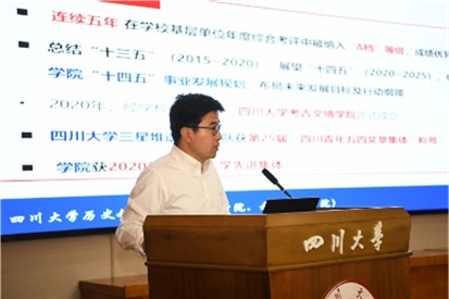 学院院长吕红亮同志作《院长工作报告》。吕院长表示,自第四届双代会以来,学院党委坚持以习近平新时代中国特色社会主义思想为指导,全面落实四川大学第八次党代会精神,坚持党建与事业统筹谋划、协同推进、深度融合,切实开创了两个伟大建设的新局面;并从加强党建,推进事业高质量内涵发展;固本强基,高质量人才培养建设成效显著;夯实基础,以一流科研驱动一流学科建设;聚焦优势,搭建高质量科研平台亮点突出;内培外引,高端人才队伍建设获新进展等八个方面,对学院各项工作成效进行汇报。吕院长强调,下一阶段,学院将继续在党委领导下,从四个方面推动学院事业高质量发展,一是全面落实立德树人根本任务,努力推进高质量人才培养;二是深入推进学科内涵发展,做大高端人才队伍规模,努力创造高质量科研成果;三是抓好学院内部不同一级学科的整合,拓展与校内其他学科的交叉,建大历史学科;四是建好用好博物馆平台、文旅融合,高质量服务国家战略。随后,吕院长作《年度财经工作汇报》,就2022年经费使用情况及2023年经费预算情况进行说明。