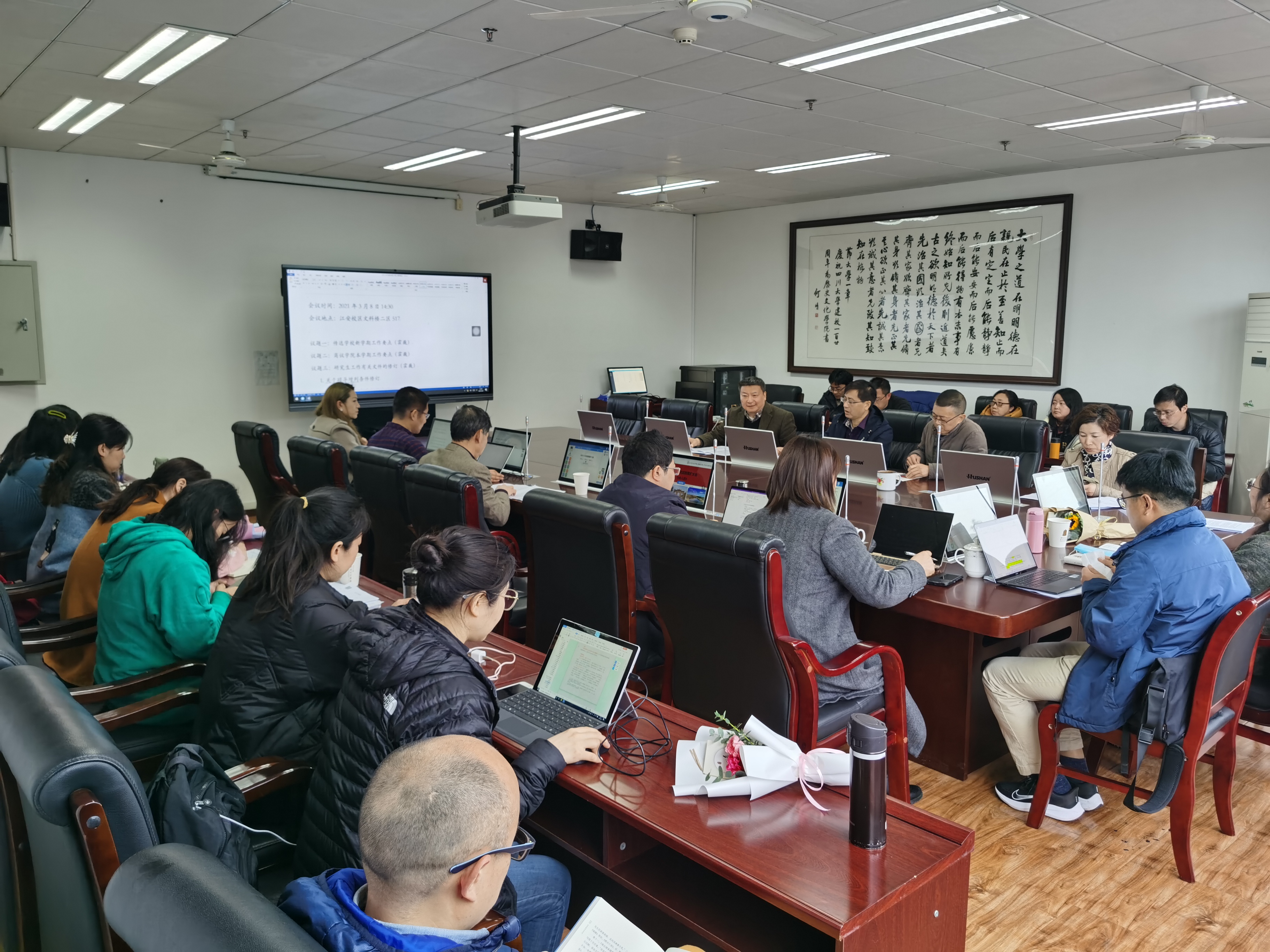 2021年度工作布置会在江安校区文科楼二区517举行, 会议传达了学校2021年度工作布置会和“双代会”精神,并对学院2021年度工作进行了安排部署。学院党政领导班子,各教研室主任、副主任,及全体行政人员参加了本次会议。