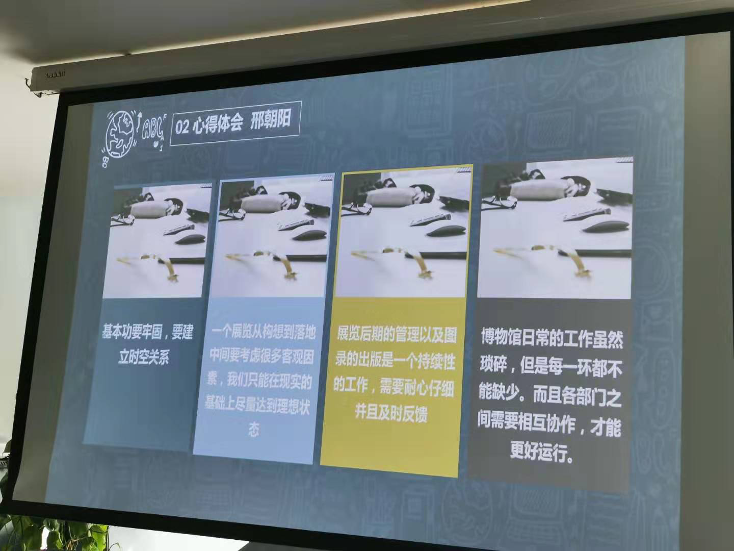 首先,10位实习同学分别汇报了各自在陈列设计部、文化创意与产业部、民俗文物部、文物保护与修复部、公共教育与社会服务部、宣传推广部、交流合作部、文物资料中心等部门的实习工作成果及收获。通过实习,同学们不仅掌握了文物与博物馆学的基本理论和技能,也培养了吃苦耐劳、严谨认真的学习态度,对文物与博物馆学有了新的认识。