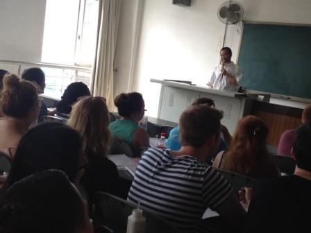国际交流营的外国学生与部分中国学生齐聚在江安校区一教A513,共同聆听了由陈波副教授给大家带来的精彩讲座。整场讲座和讨论以全英文进行。陈波副教授引经据典,在短短的1个半小时里为我们呈现了影响深远的中西交往历史。