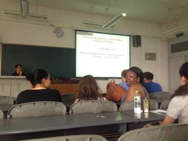 国际交流营的留学生与部分中国学生齐聚在江安校区第一教学楼A座513教室,共同聆听了由作为四川大学最受学生欢迎教师之一的周毅教授为大家带来的题为“佛教、道教与中国古代政治”的精彩讲座。