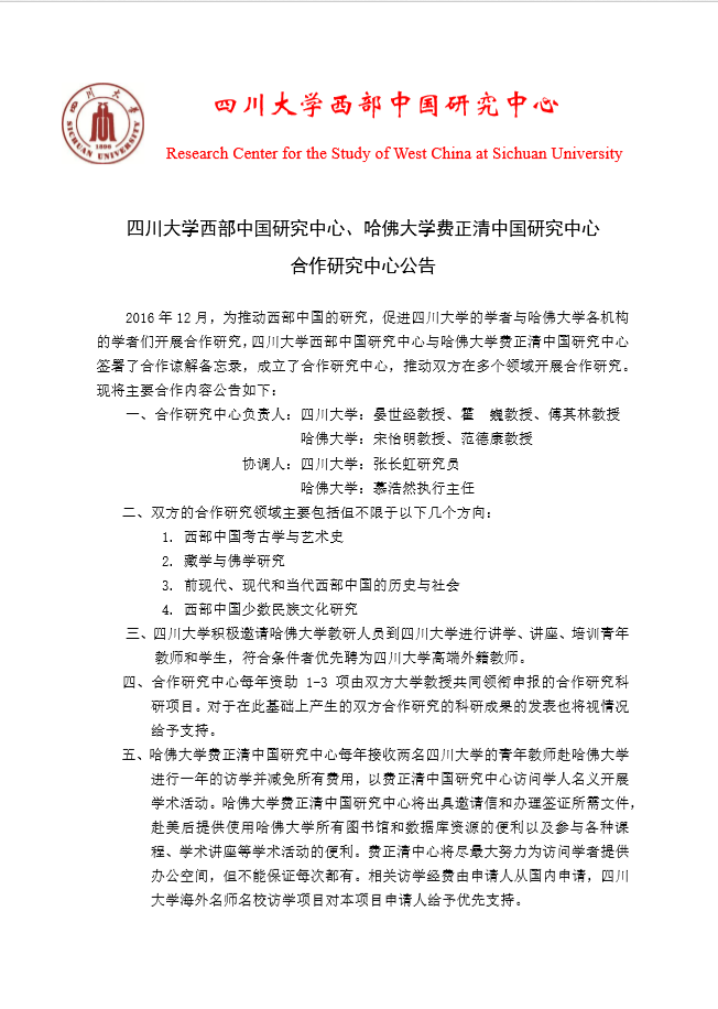 四川大学西部中国研究中心、哈佛大学费正清中国研究中心 合作研究中心公告